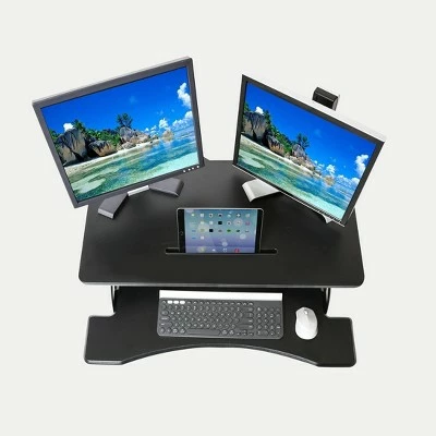 Get more active throughout your day with Seville Classics AIRLIFT® 33″ Electric Standing Desk Converter. Stand up and avoid the potential health risks from unhealthy sedentary behaviors like excessive sitting with this desk-on-desk style workstation in black. The top tier (33.5″ x 20″ x 0.59″ thick) is designed to support single monitor, dual monitor, and laptop + monitor setups with ease, and includes groove for tidy cord management. A built-in stand lets you prop up tablet computers and smartphones for viewing and use while you work. Includes a detachable keyboard tray (32.3″ x 12.4″ x 0.59″ thick) designed with an ergonomic curve for maximum user comfort. A powerful electric motor provides even, effortless height adjustment; set it at any height from the minimum of 5.9 inches to a maximum of 19.7 inches high and any distance in between. Adjusting the height with the AIRLIFT® technology buttons on the controller is as easy as pressing a button. Includes a 5V 2.1A (10 Watt) USB port for charging smartphones and tablets in the media stand while you work. Our desk is designed to save space by moving vertically so that it stays inside its original footprint when adjusting up and down. Unit comes pre-assembled for easy set-up. Simply unpack, attach the tray, plug in, and get to work.