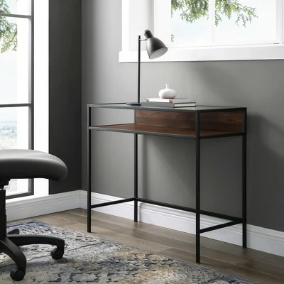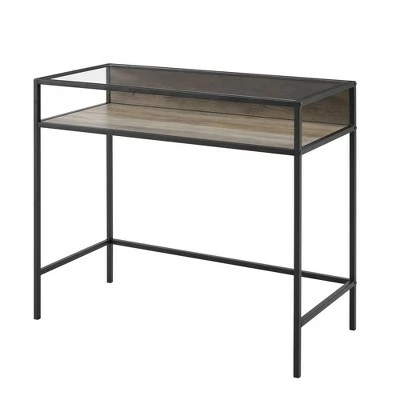 This computer desk from Saracina Home has a gorgeous mixed material design for a stylish addition to your home. In a versatile and compact design, this desk can be utilized as a work desk in your home office or a vanity in your bedroom for storing your makeup. Having a steel metal frame, laminate wood grain shelving, and a tempered safety glass table top for an urban industrial style. Store your beauty items or work essentials on the open shelf below the glass top. In a simple design that doesn’t take up much space in your home.