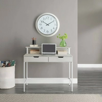 The Contempo Desk’s generous 40″ x 20″ work surface is ideal for your busy home office. The refined lines of the sturdy steel frame will be the focal point in your room. Upper shelf provides space for a monitor. Key storage solutions of 2-Desktop drawers for all your small accessories. Available in white laminate with white metal frame, or brown woodgrain laminate with black metal frame. Assembly is required.
