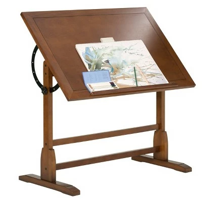 The classic design of the 42″ Canvas & Color Retro Wood Table from Studio Designs is reminiscent of earlier years with its all-wood construction, rustic oak finish and classic design. It features ample work space on elegantly distressed wood with a built-in pencil groove that keeps your utensils right in place. The antique finished surface top adjusts so you can choose to work on an angled or flat surface.