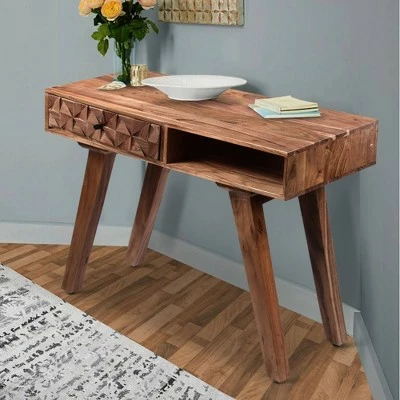 Amalgamate your study space with the introduction of this farmhouse style inspired Writing Desk. Incorporated with a smooth gliding drawer and an open cubby to keep your stationery items organized, the 3 dimensional textured detailing on the drawer front accentuates its look. Constructed sturdily from the acacia wood frame for lasting durability, the oak brown finish complements its appeal. Supported on angled legs and equipped with floor protectors to prevent abrasion, the aesthetically pleasing grain details add a riveting charm to it. Even though it is inspired by farmhouse style, it readily blends with a variety of decor settings without compromising the integrity of interior.