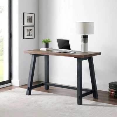 Add a unique touch to your home with this desk. The lightly distressed black sawhorse leg design gives it a rustic, yet industrial feel. The solid wood top finish highlights natural wood variations such as cracks and knots which add to the piece’s character. This collection is sure to make a statement in your home. This desk is sure to give your workspace a stylish touch, while also giving you plenty of space to tackle your to-do list.