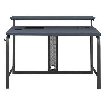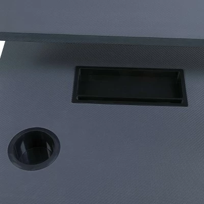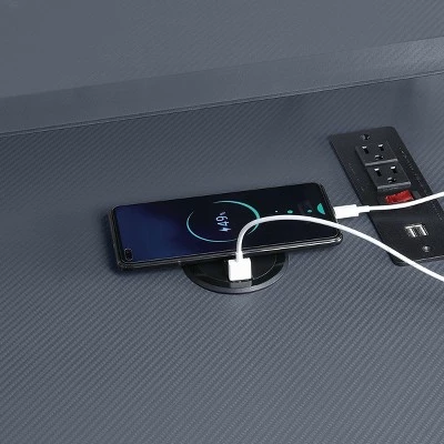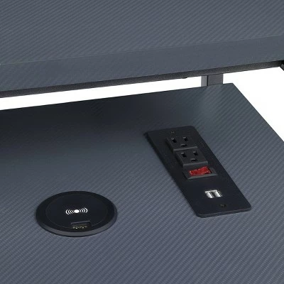Impact your gaming experienced the reload 48” gaming desk. Elevated monitor shelf is positioned for an ideal viewing height, reducing neck, shoulder and eye fatigue. Roomy, 48” lower surface provides substantial room for all your gaming gear. Immerse yourself fully in your gaming experience with RGB LED lights. Customize the location of your power up preferences with both a smart, wireless charging pad and USB power-port. Keep eyes in the game with strategically placed device holder and accessory tray. Integrated storage along with our power cable management system, keeps your area distraction free, and supports a seamless transition from gaming to home office work station. Sturdy steel construction frame with exciting chevron pattern PVC carbon fiber surface will last for years of competitive enjoyment. Headphone hook and drink holder completes this winning choice.
