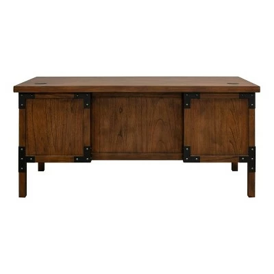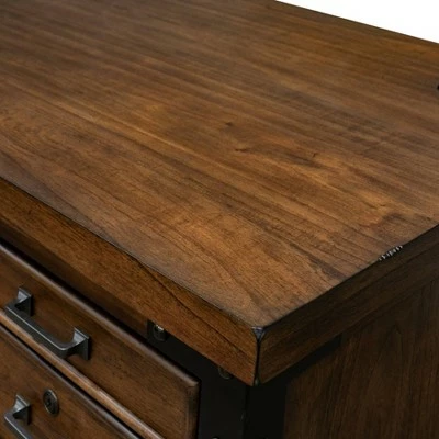 The Addison collection is inspired by antique, industrial tool boxes. Its dry Auburn finish highlights the natural beauty of the open grain veneers. Heavy iron casters with optional lock add function to the design. Black iron corner brackets and strapping add an element of authenticity, while light distressing enhances the aged appearance.