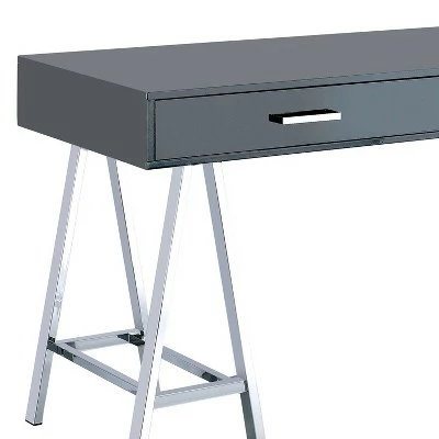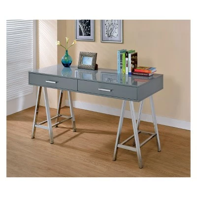 Add a sleek, sensational modern twist to your home decor with the Homes: Inside + Out Aleman Contemporary Writing Desk. A striking design features a cool gray finish box desktop and contrasting chrome legs in an industrial-inspired motif. Enjoy roomy drawers offering storage space for writing utensils, papers, and other work essentials. Add this metal-frame desk to your office, hallway, craft room, or any room that needs extra work space and a fresh, contemporary look.
