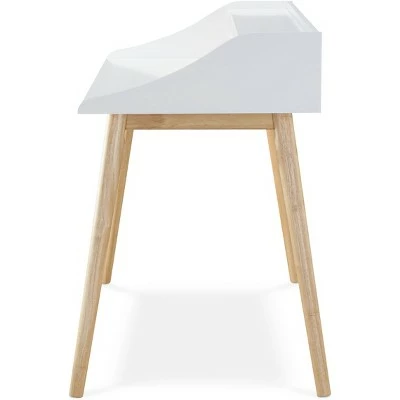 Bring mid-century modern style and sophistication to your room with this compact writing desk. This desk has a fresh white finish and light natural wood legs for a neutral color that fits in any room style. In addition to the popular mid-century style, this desk has a slim profile, allowing it to fit easily in a small room or apartment space without fear of the desk overpowering the room. Storage on this desk is available in the cubbies and shelf, while the desk top has enough room to hold a laptop computer.