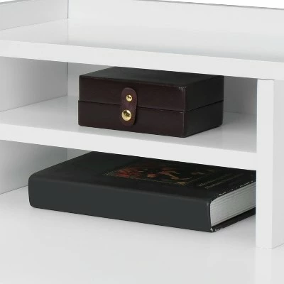 - Two leveled shelf and storage cubbies add to the functionality of this desk