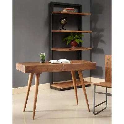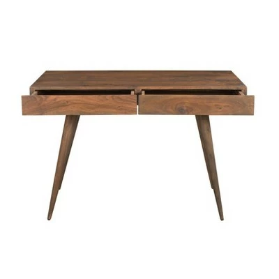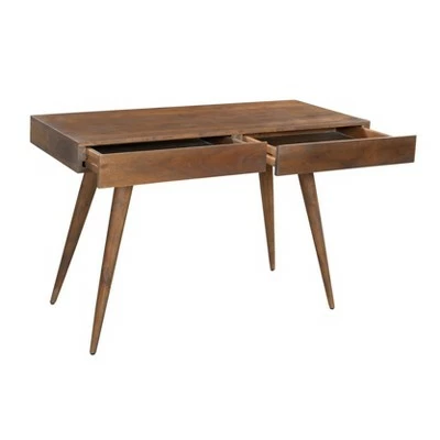 Introducing our Aniyal Light Brown finished writing desk! The simple shapes and clean lines of the tapered and angled legs are the hallmark of Mid Century Modern. Finished all the way around so placment is a breeze, and with two wide drawers to hold your paper, pens, or remotes, this desk will be an assett in any room.