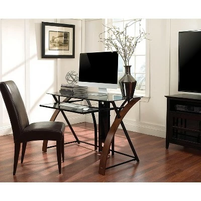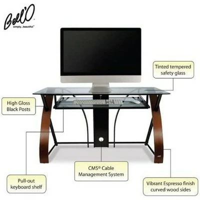 This unique and elegant open architecture computer desk features a beautiful combination of curved wood sides, sturdy steel framing, and tinted tempered safety glass. The curved wood sides are finished in a vibrant Espresso color, and are complemented by the dramatic intersecting High Gloss Black posts. There is a center pull-out shelf to accommodate a keyboard and mouse. The keyboard shelf sits 3.25 inches beneath the desktop, leaving knee clearance under the keyboard tray of 25 inches. The desk is Easy to assemble with just a Phillips head screwdriver.