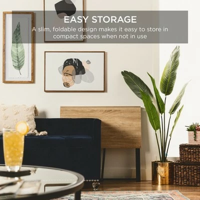 Convenience is at your fingertips with this space-saving desk! A quick & easy setup is just 3 steps: Step 1, attach the frame supports to the table top. For Step 2, unfold the frame and attach it to the table top. Lastly, Step 3 is to tightly secure the legs and table top. This table is great for small spaces, perfect for any living space, including your apartment, dorm, or an office in your home. Even with a 29.25 depth, it’s built for easy storage, with a slim, foldable design that makes it easy to store in compact spaces when not in use. Plus, the compact design and drop leaf option let you fold it down and utilize the back shelf for storage of small desk items while saving space in any room. This desk is also built to last, with a durable, water- & scratch-resistant wood surface and sturdy steel frame, so you can enjoy a quality workspace for years to come.”