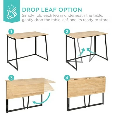 Convenience is at your fingertips with this space-saving desk! A quick & easy setup is just 3 steps: Step 1, attach the frame supports to the table top. For Step 2, unfold the frame and attach it to the table top. Lastly, Step 3 is to tightly secure the legs and table top. This table is great for small spaces, perfect for any living space, including your apartment, dorm, or an office in your home. Even with a 29 depth, it’s built for easy storage, with a slim, foldable design that makes it easy to store in compact spaces when not in use. Plus, the compact design and drop leaf option add concenience; simply fold each leg in underneath the table, gently drop the table leaf, and its ready to store! This desk is also built to last, with a durable, water- & scratch-resistant wood surface and sturdy steel frame, so you can enjoy a quality workspace for years to come.”