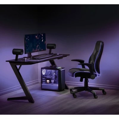 Level up your game setup. The BETA Gaming Desk offers the competitive platform your high-octane gaming demands. Large surface provides ideal space for monitor and gaming accessories. Customize the location of your power-up preferences with our magnetic 3-port smart power USB hub. Enjoy total game immersion with Bluetooth controlled RGB LED lights that let you set the mood. Our power strip bracket and cable management system offers a seamless transition from gaming to workstation making this your perfect media hub. Compelling Z frame design and sturdy steel construction in exciting red, blue and stealth black with matte black game surface will provide years of competitive enjoyment.