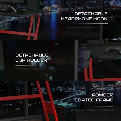Loading… Introducing the Stratum Elite gaming desk from BlackArc. Activated with a powder coated finish frame, and sleek surface area big enough for dual PC monitors. The detachable cupholder and headphone hook allows you to take a breather while keeping track of your equipment. Keep your cords in order with two cable management grommets. S-shaped framing includes screw-in leveling floor glides. Additional Features: Detachable Cup Holder and Headphone Hook, Supports up to 150 LBS. Static Weight Capacity, Screw-In Leveling Floor Glides