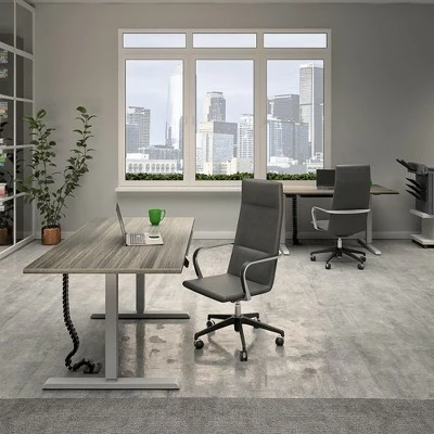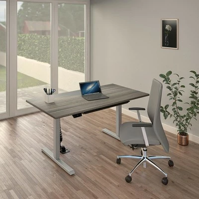 Create an unparalleled organized, ergonomic and functional office space with the commercial adjustable height E-Lift Pro-Desk by Bridgeport ™. The ergonomic benefits and electronic features help you to increase productivity and counteracts the effects of prolonged sedentary times. The actifit app on your smartphone paired with an ultra-silent European-designed motor allows you to easily adjust your desk to the desired height. Features a 3-memory-key control panel to customize the height to your needs, whether you are sitting, standing, or in a stool. Elevate your office space – in office or at home – and encourage healthy work habits. Crafted with high quality components such as a commercial grade laminate that is humidity and scratch resistant, this best-in-class adjustable, all-steel frame is fully compliant with ANSI/BIFMA standards. This worry-free product comes with a 10-year Limited Warranty. The E-Lift Pro-Desk accommodates all your needs in 3 different finishes – espresso, white, and gray wood grain.