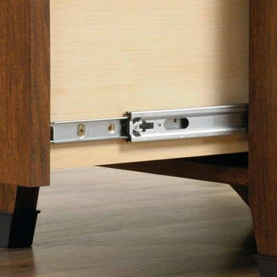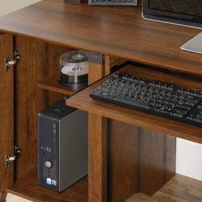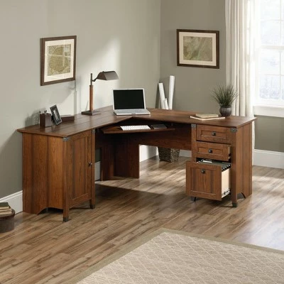 Maximize the space in your home office or work space with this corner computer desk from the Carson Forge® collection. Its spacious table top surface provides you with ample amount of room for all your must-have desk essentials and more – laptop, pens and papers, important documents and even a little home décor. It features a slide-out keyboard/mouse shelf that opens and closes on smooth metal runners. It also includes three easy gliding storage drawers for easy access storage of miscellaneous office items. The lower drawer with full extension slides holds letter, legal or European size hanging files. Talk about organization! Behind the swinging door is a hidden area that includes an adjustable shelf and accommodates a vertical CPU tower. It also features a grommet hole so you can keep all your cords and wires neat and out of the way. Finished in Washington Cherry and accented with wrought iron style hardware, this beautiful desk has the style and functionality your home office needs.