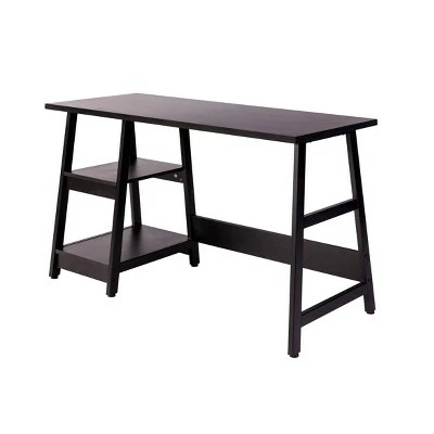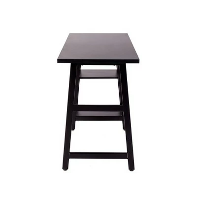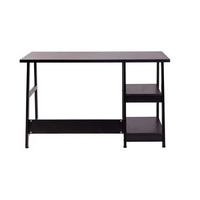 The 50-1901 Coletta Single Trestle Writing Desk is a small simple home office desk that delivers both form and function. The solid steel frame is both stylish and sturdy, and the melamine laminate finish is scratch-, shatter-, and water-resistant. Two shelves under the left side of the desk provide easily accessible storage, while the expansive desktop supplies an ample workspace with a weight capacity of 110lbs.
