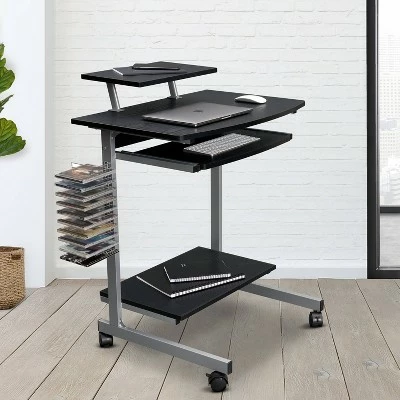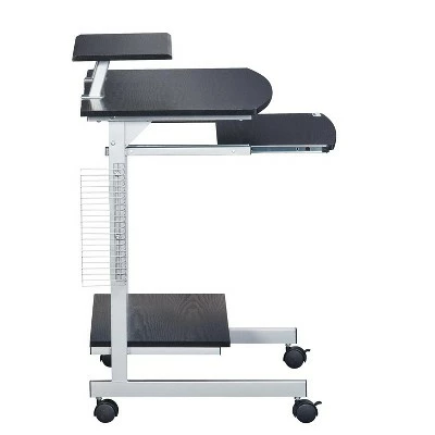 This Techni Mobili Compact Computer Cart is made with heavy-duty engineered wood panels with a moisture resistant PVC laminate veneer and a scratch-resistant powder-coated steel frame. The adjustable shelf can be mounted center, right or left of desktop. It also features a slide-out keyboard shelf equipped with a safety stop, side media rack for CDs or DVDs, bottom accessory shelf, large bottom shelf to accommodate a CPU and accessories, and large double-wheel non-marking locking casters. The desktop has a 100lb weight capacity, the shelves each have a 30lb weight capacity, and the keyboard shelf can hold up to 20lbs. Color: Graphite