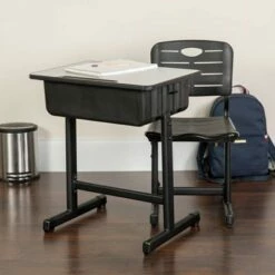 The large surfaced desk is open to provide you with plenty of work space for papers, writing utensils and a laptop. The raised border prevent papers from easily falling off the edge of the table. The attractive silver powder coated crisscross legs add the modern touch to keep it in style to grow with your preteen to college bound student.