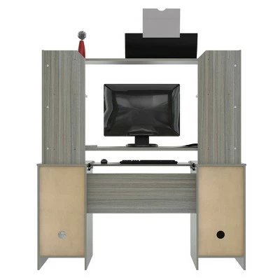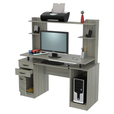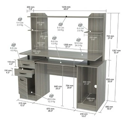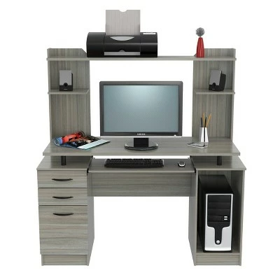 Computer Work center w/Hutch by Inval finished in a rich “Smoke Oak” laminate with durable melamine which is stain, heat and scratch resistant. It is constructed from manufactured wood. This unit offers an ample work surface making it a perfect addition to any home office or office. One (1) pedestal has two (2) accessory drawers with metal slides and a concealed storage compartment. The other pedestal is an open compartment for storage or a CPU. It includes a pull-out keyboard shelf with metal drawer glides, brushed metal handles and risers. The hutch features three (3) shelves to accommodate accessories. Both pedestals have plastic base gliders to protect the unit when moving it.