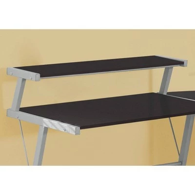 This contemporary minimalist L shaped desk will make a great addition to your home office. Finished in a sophisticated cappuccino accented in silver metal with cool industrial style metal legs on a sturdy base, this 3pc set offers a modern edge and versatility whether you place it in the middle of a room or tucked into a corner. This unit’s generous size will accommodate your laptop, a corner lamp, with a convenient raised shelf that can easily be used to place books, office essentials, or decorative objects.