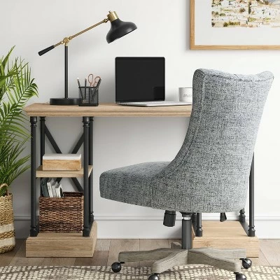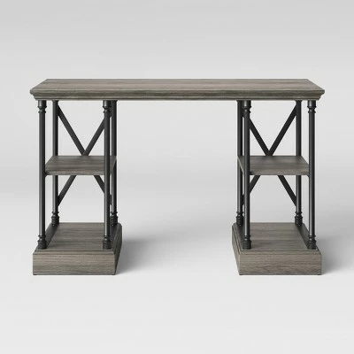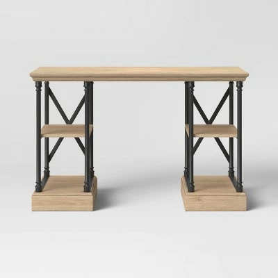 Set an understated foundation to your work space with this Conway Cast Iron Desk from Threshold™. Crafted from a durable material, this wood and iron desk showcases a clean-lined frame with a rustic top, supported by two X-crossed iron sides for a sleek touch. The tabletop provides the perfect spot to set down a laptop or spread out supplies for a project, while four open drawers can store stationery and other writing supplies. Simply mix and match this iron desk with your choice of items to create a cohesive, coordinated space.