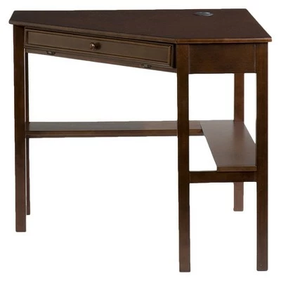Create a space-saving workstation in your home with this Corner Desk from Aiden Lane. This wooden corner desk features a beautiful dark espresso finish and a simple triangular design that will coordinate beautifully with your existing decor style. The spacious tabletop offers enough room for a computer and a picture frame or vase, while you can conveniently stash a keyboard in the tray below. Plus, the built-in bottom shelf helps you keep other office essentials within reach.