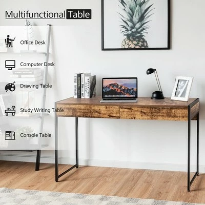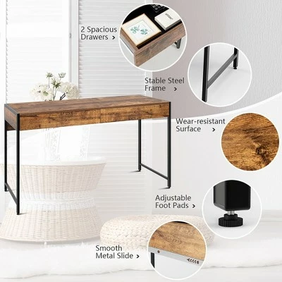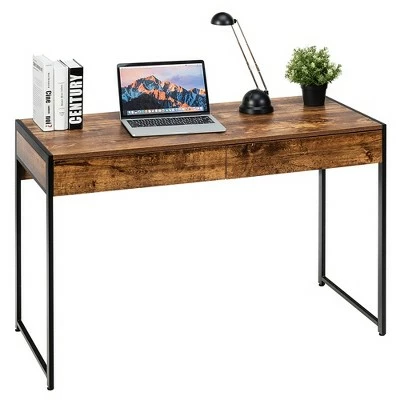 Our office desk will offer you a comfortable office environment!. Crafted of high-quality engineered wood with sturdy steel frame, this office desk is corrosion-resistant and durable for long-term use. And adjustable leveling footpads ensure good stability and floor protection. What’s more, featuring spacious desktop and 2 large drawers, the office desk provides ample space for computer, monitor, documents and other items. It is suitable for working, gaming, writing, studying and training. Precision workmanship with realistic wood grain will add a touch of charm and elegance to your home. Clean and stylish design makes it ideal for bedroom, study, office, etc. . Specification: Color:Brown Antique Black. Material: Engineered Wood + Steel. Overall Dimensions: 44” x 19”x 30”(L x W x H) . Weight Capacity: 220 lbs. Net Weight: 36 lbs. Package included: . 1 x Office Desk. 1 x Manual.