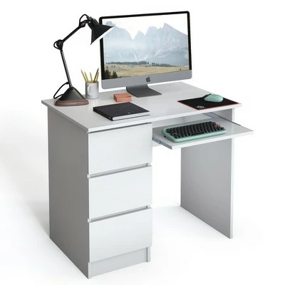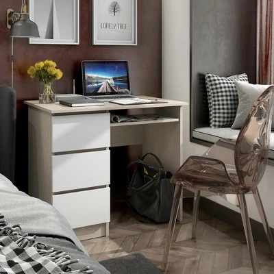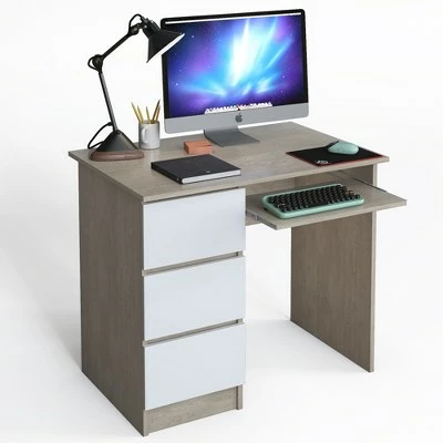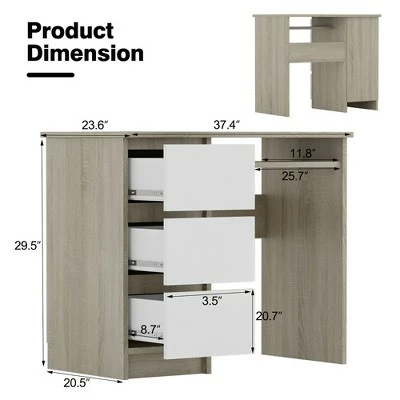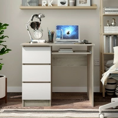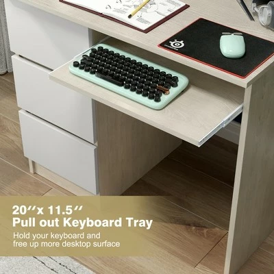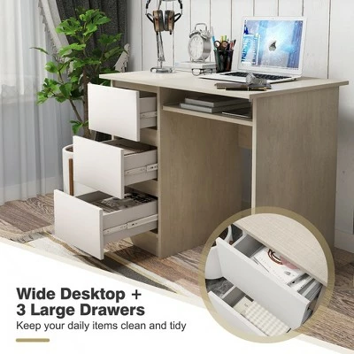Have you found a favored computer desk for your working, studying and reading? . Our computer desk is a perfect choice for your home and office. 3 sided drawers greatly satisfy your demand to place variety of daily items. Besides, the office desk is designed with spacious desktop to ensure optimal workspace and makes your stuffs with reach. Solid engineered wood enhances impeccable strength and durability for long-term use. Specially-designed ergonomic height provides you with much more comfort when sitting in the front of the computer desk. With simple yet stylish design, this study desk is merged with different home styles. . Specification: Color: WhiteOak. Material: Engineered Wood. Overall Dimension: 35.5” (L) x 20” (W) x 30.5” (H) . Drawer Size: 10” (L) x 16” (W) x 4” (H) . Dimension of Keyboard Tray: 20” (L) x 11.5” (W) x 4” (H) . Net Weight: 62 lbs. Weight Capacity of Each Drawer: 33 lbs. Weight Capacity of Desktop: 33 lbs. Package Includes: . 1 x 3-drawer Computer Desk. 1 x User Guide.