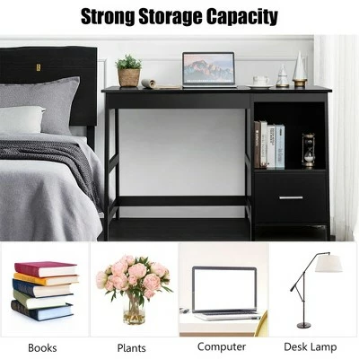 Perfect addition for both home and officeThis modern desk is of simple and fashionable appearance to decorate your room and up-grade its overall temperament. With the footrest designed at the bottom, you will feel more comfortable when sit on. Equipped with two drawers and a shelf, it provides spacious space for you to store necessary supplies. As the material we use is of P2 MDF, there will be no worry about the health of you and your family. The superior material also ensures strong construction and long service time. Do not hesitate. Specification: Color: Black. Product Size: 47.5” x 20” x 30.5” (L x W x H). Desktop Load Capacity: 150 lbs. Drawer Load Capacity: 20 lbs. Shelf Load Capacity: 30 lbs. Material: P2 MDF. Net Weight: 55.5 lbs. Package Includes:. 1 x Computer Desk. 1 x User Guide.
