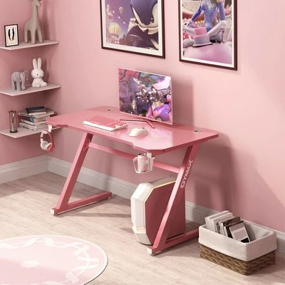 With its humanized and ergonomic design, our gaming desk provides you with an optimal gaming experience! Equipped with the Z-shaped metal frame and a thickened crossbeam, it can load up to 330lbs. Plus, adjustable foot pads keep balance on uneven floor for great stability. What’s more, the gaming desk with 47” spacious tabletop offers you roomy space to work or play. 2 cable management holes help to store the messy wires in order. And horizontally rotatable cup holder and headphone hook save available desktop space for other gaming supplies. Gaming desk with suitable height can match various gaming chairs, and its modern style also fits different home decoration. Our gaming desk is sure to be a special addition to your home and office. Specification: Color: Pink. Material: MDF + Steel. Overall Dimension: 47” x 23.5” x 27.5” (L x W x H). Net Weight: 36 lbs. Max Load Capacity: 330 lbs. Package Includes:. 1 x Gaming Desk. 1 x User’s Manual.