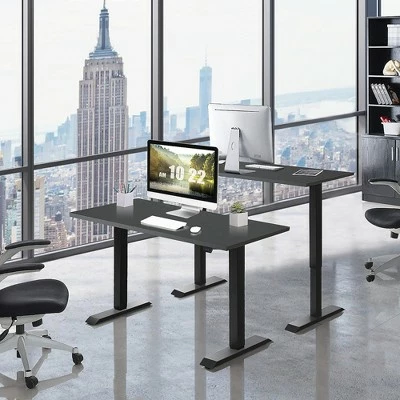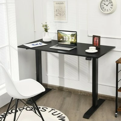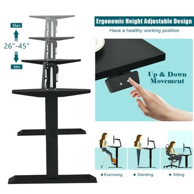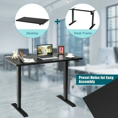 Lead a healthier and more productive life with our electric height adjustable standing desk.. Our stand up desk features a motor lift mechanism which offers smooth and noiseless height adjustment from 26” to 45 ” to meet your needs of various working postures. You can change it from sitting to standing with just a touch of the up/down button. It can help relieve your fatigue caused by sedentary work. The 48”x24” one-piece desktop provides a spacious working area that can support 2 monitors without collapsing. With excellent workmanship, the desktop features round corners and smooth edges to prevent you from being hurt. The heavy duty steel frame and adjustable foot pads make our standing desk super sturdy and stable. Besides, screw holes on the tabletop have been drilled, which can save much of your time and energy to finish the assembly work. . Specification: Color of Desk Frame: Black. Color of Desktop: WhiteBlack. Material: Steel, Engineered Wood, PVC. Overall Dimensions: 48” x24” x 26”-45” (LxWxH) . Desktop Thickness: 0.7” . Speed:0.8”/s. Noise Level:≤45dB. Net Weight: 60 lbs . Weight Capacity: 155 lbs. . Package Includes:. 1 x Electric Standing Desk . 1 x Instruction.