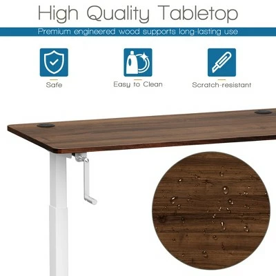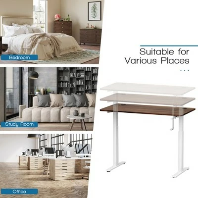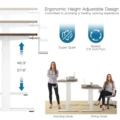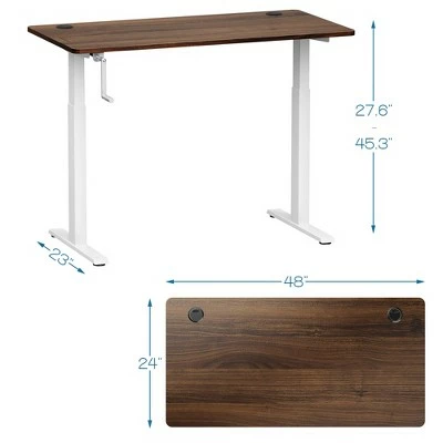Say goodbye to long hours of sitting with our manual height adjustable standing desk!. Our standing desk features a simple crank handle system which uses minimal effort to adjust the desk height from 27.6” to 45.3” to meet your needs of various working postures. It can help relieve your back and neck pain caused by sedentary work. The crank handle is foldable and can be installed on either left or right side. The robust steel frame and adjustable foot pads make our standing desk sturdy and stable enough. The 48”x24” desktop with 2 cable holes provides a spacious working area and plenty of space for office supplies. It also comes with a cable rack and hook to organize the wires in order and hang your headphone conveniently. Besides, screw holes on the tabletop have been drilled, which can save much of your time and energy to finish the assembly work. . Specification: Color of Desk Frame: WhiteBlackGrey . Color of Desktop: Walnut . Material: Steel, Engineered Wood . Overall Dimensions: 48” x24” x 27.6-45.3” (LxWxH) . Desktop Thickness: 1”. Speed:0.5 inch /Turn. Net Weight: 62 lbs . Weight Capacity: 110 lbs. Package Includes:. 1 x Standing Desk . 1 x Hook . 1 x Cable Rack . 1 x Crank. 1 x Instruction.