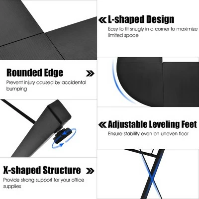 Our modern L-shaped corner computer desk provides a comfortable work environment to you!. This simple L-shaped table that is made of P2 MDF and iron pipe consists of two rectangular desktops and metal legs, which are connected together in L-shape to obtain sufficient surface space. They are compactly placed in the corner of the room. Let you enjoy comfortable office hours, but also can save room space. This L- shaped computer desk can be used in many ways. You can put them in office, study or living room. In addition to work, you can also have leisure and entertainment on it. This table is simple and beautiful in appearance, and it is a good choice for you.. Specification: Color: BrownBlack. Material: P2 MDF + Iron Pipe. Net Weight: 55 lbs. Weight Capacity: 220 lbs. Overall Dimension: 59” x 59” x 30” (L x W x H) . Package includes: . 1 x L-Shaped Desk. 1 x Instruction.
