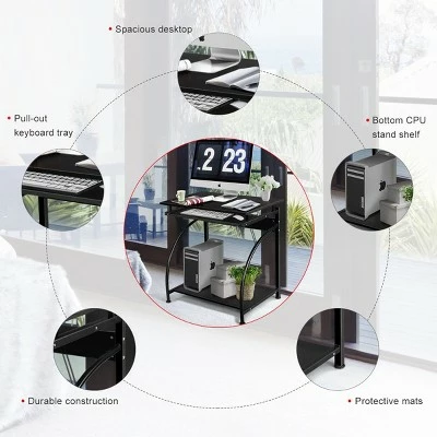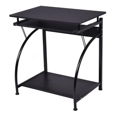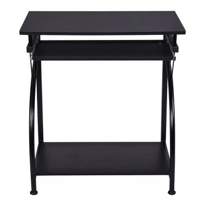 This is our computer desk, which is a perfect furniture for your home or office and provides you with a unmatched convenience. The engineered wood construction and powder coated steel frame provide years of sturdy and reliable use. It features a smooth slide-out keyboard shelf and a full size workstation, allowing you to lay out your tasks and complete them efficiently. An extra bottom shelf provides space for the computer host or books. Specification: Material:MDF + Steel. Overall size:27.6”Lx18.5” Wx29.2” H. Keyboard size:23.2”Lx9.4” W. Bottom shelf size:25.2”Lx15.0” W. Height form floor to bottom shelf:2.8”. Package includes:1 x Computer desk.
