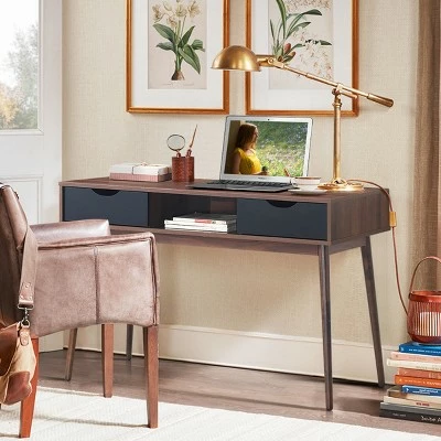 The natural mid-century writing desk will be perfect solution to limited apartment for its compact and space-saving design. Wide desktop provides spacious surface for many items from lamp and decorative plants to computer and magazines. Practical drawers with grooved handles ensure overall streamlined appearance and create sufficient classified storage space at the same time. Open drawer in between in convenient for taking in and out supplies directly. Thickened splayed legs keep the writing desk as stable as possible. Furthermore, the writing desk adopts durable as well as safe engineered wood, which can not only offer longer service time but also ensure great reliability for your frequent daily usage. . Specification: Color: As the picture shows. Material: Engineered Wood. Dimension: 47″X22″X31″(LXWXH) . Net Weight: 48lbs. Weight Capacity: 55 lbs. Each Drawer Weight Capacity: 11 lbs. Storage Shelf Weight Capacity: 22 lbs. . Package Includes: . 1 X Writing Desk. 1 X Instruction.