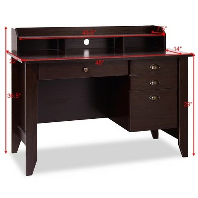 This is our computer desk, which is a perfect furniture for your home or office and provides you with a unmatched convenience. The engineering MDF construction provides years of sturdy and reliable use for you. It features a smooth slide-out long drawer and three spacious side drawers, offering large storage space for your daily supplies. A desktop shelf provides more storage space for books, photo frame or cups. Enjoy your writing with this practical and elegant desk. Buy yours today!. Specification: Overall size:48”L x 22” W x 36.5” H. Workstation dimension:48”Lx 21.7”Wx29.1” H. Dimension of top shelf:43.3”L x 7.3”W. Dimension of left drawer:22.8”L x 13.4”W x 2.2”Deep. Dimension of right &upper drawer:12.0”Lx 13.4”Wx 2.2”Deep. Dimension of right &bottom drawer:12.0”Lx 13.4”Wx 5.3”Deep.