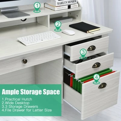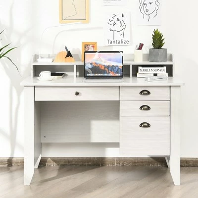 This is our brand new computer desk, which is a perfect furniture for your home or office and provides you with a unmatched convenience. The engineering MDF construction provides years of sturdy and reliable use for you. It features a smooth slide-out long drawer and three spacious side drawers, offering large storage space for your daily supplies. A desktop shelf provides more storage space for books, photo frame or cups. Enjoy your writing with this practical and elegant desk. Buy yours today!. Specification: Color: White. Material: MDF. Overall size: 48” Lx 22” Wx 36.5” H. Workstation dimension:48” Lx 22” Wx 29” H. Dimension of top shelf: 43.5” L x 7.5” W. Dimension of left drawer: 22.8” L x 13.4” W x 2.2” Deep. Dimension of right &upper drawer: 12.0” Lx 13.4” Wx 2.2” Deep. Dimension of right &bottom drawer: 12.0” Lx 13.4” Wx 5.3” Deep. Package includes:. 1 x Computer desk. 1 x Instruction. .