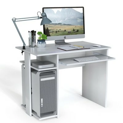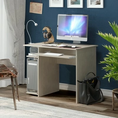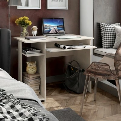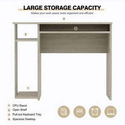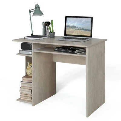 Our functional and modern computer desk will be a perfect complement for your home or office. . Featuring a spacious desktop, 2 open shelves, and a slide-out keyboard tray, this computer desk is large enough to accommodate a great mount of office supplies. Firm construction with thickened board makes it more sturdy for extended service life. What’s more, the simple but not monotonous design enables it perfect for office, home, gaming room as an office desk, bedroom and make up desk. Keep your space tidy with our utility computer desk. . Specification: Color: WhiteOak . Material: P2 Engineered Wood. Overall Dimension: 37.4” x 23.6” x 29.5” (L x W x H) . Upper Shelf Size: 8.7” x 20.5” X5.9” (L x W x H) . Lower Shelf Size:8.7” x 20.5” X20.7” (L x W x H). Keyboard Tray Size: 25.7” X11.8” (L x W) . Net Weight:51lbs. Weight Capacity of Desktop:22lbs. Weight Capacity of Shelf:11lbs. Weight Capacity of Keyboard Tray:11lbs. . Package Includes: . 1 x Computer Desk. 1 x Instruction.