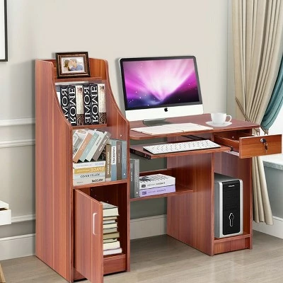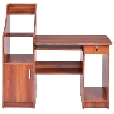 Our unique and elegant desk features sliding keyboard tray, lockable drawer, multiple shelves and heavy duty cabinet, creating storage and display area for all your office needs with plenty of table space for your computer and accessories and using your space effectively. And it is made of 0.6” thickness MDF, and edge banding with melamine, durable and scratch resistant. Besides, stylish design and neutral color fit with your room decor. It is both practical, reliable, economical, as well as beautiful to look at. Specification: Package Include:1 x Computer desk. Material: MDF. Color: red walnut. Net weight: 68 Lbs. Weight capacity: 132 Lbs. Overall dimensions: 44” x 18” x 44” (L x W x H). Size of the Cabinet: 12” x 15” x 16” (L x D x H). Size of the Drawer: 10” x 12” x 4” (L x D x H)