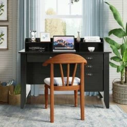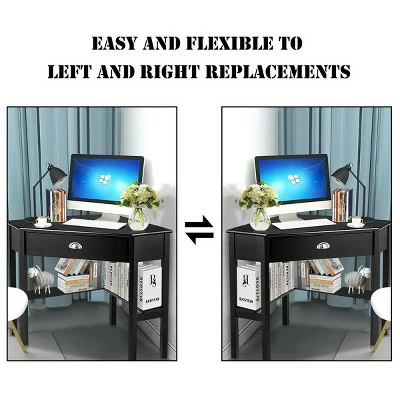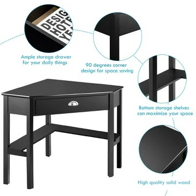 This is our corner computer desk, which is a perfect furniture for small living space and provides you with a unmatched convenience. The space-saving corner design make it fit to any room. With solid wood construction, this computer desk provides years of sturdy and reliable use. It features a large slide-out drawer, allowing you to keep your supplies organized. Bottom book shelves provides more storage space for its user. Add it t your cart now! Specification: Material:Pine +MDF + PB. Color:Black. Overall Dimension: 41.5”Lx 28”W x 30”H. Package includes:1 x Computer desk;1 x Instruction. . .