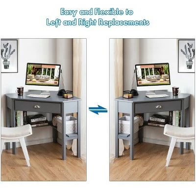 This is our corner computer desk, which is a perfect furniture for small living space and provides you with a unmatched convenience. The space-saving corner design make it fit to any room. With solid wood construction, this computer desk provides years of sturdy and reliable use. It features a large slide-out drawer, allowing you to keep your supplies organized. Bottom book shelves provides more storage space for its user. Add it t your cart now! Specification: Material:Pine +MDF + PB. Color:Black. Overall Dimension: 41.5”Lx 28”W x 30”H. Package includes:1 x Computer desk;1 x Instruction. . .