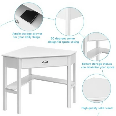 This is our new corner computer desk, which is a perfect furniture for small living space and provides you with a unmatched convenience. The space-saving corner design make it fit to any room. With solid wood construction, this computer desk provides years of sturdy and reliable use. It features a large slide-out drawer, allowing you to keep your supplies organized. Bottom book shelves provides more storage space for its user. Add it t your cart now! Specification: Material:Pine +MDF + PB. Color:White. Overall Dimension: 41.5”Lx 28”W x 30”H. Package includes:1 x Computer desk;1 x Instruction. . .
