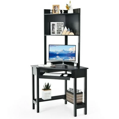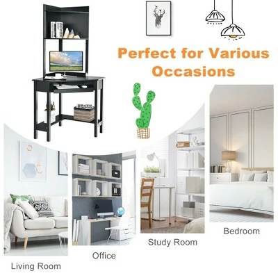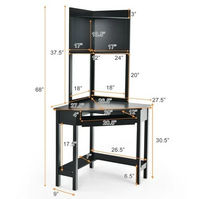 If you looking for a computer desk with lots of storage space and perfect for limited room, our corner desk implements just what you want. This corner desk is sturdy enough to hold all of your items. Attached hutch and bottom shelf offer ample storage space for home office supplies while the durable and spacious desktop provides you with optimal workspace. The unique corner design is a great solution for optimizing space and also makes your room cleaner. Simple lines and modern style perfectly decorate your home and create an efficient workspace for everyone! Specification: Color: Black / White. Material: MDF, Engineered Wood, Natural Wood. Overall Dimension: 27.5”(L) x 27.5”(W) x 68”(H). Overall Dimension of Table: 27.5”(L) x 27.5”(W) x 30.5”(H). Overall Dimension of Hutch: 18”(L) x 18”(W) x 37.5”(H). Net Weight: 49 lbs. Weight Capacity of Table: 88 lbs. Weight Capacity of Each Shelf: 22 lbs. Weight Capacity of Compartment: 11 lbs. Package Includes:. 1 x Corner Table with Hutch. 1 x User Guide.