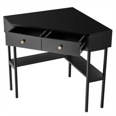 Do you want to have a table that can not only offer you adequate storage space but also help you save room at the same time? Now try ours. . Featuring special corner design, our corner desk can save more space than traditional tables. In the corners of different rooms, our wall writing desk can effectively use the limited space to create a private study space. Of course, you can also place it on other occasions according to your needs. Meanwhile, the study workstation has 2 drawers and open shelves, which allows you to freely sort items. The overall structure is made of sturdy material, so that the weight capacity of each part has been greatly improved. 4 steel legs also enhance overall stability. With the help of convenient rounded handle and smooth sliding rails, you can pull the drawers inside or outside more effortlessly. . Specification: Color: WhiteBlackGold. Material: MDF, Steel. Net Weight: 43.2 lbs . Overall Dimension: 39.5” x 28” x 29.5” . Drawer Depth: 9.4” . Weight Capacity of Tabletop: 88 lbs. Weight Capacity of Each Drawer: 11 lbs. Weight Capacity of Each Shelf Compartment: 44lbs. Package Includes: . 1 x Corner Computer Desk. 1 x User Guide.