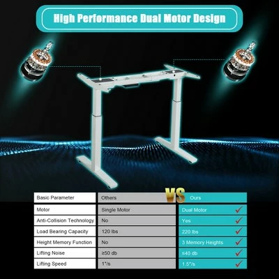 - Dual Motor Lift System: This electric standing desk frame is equipped with an intelligent push-button controller for easy operation. There are 3 preset buttons to customize your desired heights. Dual motors offer more smooth height adjustment at a speed of 1.5”/s with lower noise under 45db while running.