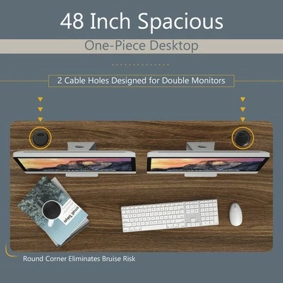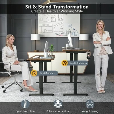 Our electric standing desk must be your first choice for a healthy working style.. Featuring 27.6” – 47.3”height adjustable design, it allows you to work at any position at will and get rid of fatigue caused by sedentary working. The advanced dual-motor system ensures smooth and quiet lift and fall. More intelligently, it will automatically stop during moving after detecting obstacles. The easy-to-operate controller allows you to preset 3 height positions, and its LED screen can show you the present height and status. In addition, it is very stable with robust metal frame and 1” thick desktop, of which bearing capacity is up to 176 lbs. . Specification: Color: Black, Walnut. Material: Steel, Engineered Wood, PVC. Product Dimensions:L:55” x 28” x 27.6”-47.3” (L x W x H). M:48” x 30” x 27.6”-47.3” (L x W x H). S:48” x 24” x 27.6”-47.3” (L x W x H). Net Weight: 70.5 lbs. Voltage: 110~240V. Load: 800N. Speed: 1”/s. Power Adapter Rated Input: AC100-240V,50/60Hz,2.0A. Power Adapter Rated Output: DC29.0V,2.0A,58.0W. Column Motor Rated Input: DC24V,5A. Controller Input/Output: DC29/29V. Full Load Current: 5A. Weight Capacity: 176lbs. Package Includes:. 1 x Electric Standing Desk. 1 x User Manual .