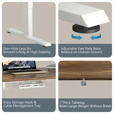 Our electric standing desk must be your first choice for a healthy working style.. Featuring 27.6” – 47.3”height adjustable design, it allows you to work at any position at will and get rid of fatigue caused by sedentary working. The advanced dual-motor system ensures smooth and quiet lift and fall. More intelligently, it will automatically stop during moving after detecting obstacles. The easy-to-operate controller allows you to preset 3 height positions, and its LED screen can show you the present height and status. In addition, it is very stable with robust metal frame and 1” thick desktop, of which bearing capacity is up to 176 lbs. . Specification: Color: White, Walnut. Material: Steel, Engineered Wood, PVC. Product Dimensions:L:55” x 28” x 27.6”-47.3” (L x W x H). M:48” x 30” x 27.6”-47.3” (L x W x H). S:48” x 24” x 27.6”-47.3” (L x W x H). Net Weight: 70.5 lbs. Voltage: 110~240V. Load: 800N. Speed: 1”/s. Power Adapter Rated Input: AC100-240V,50/60Hz,2.0A. Power Adapter Rated Output: DC29.0V,2.0A,58.0W. Column Motor Rated Input: DC24V,5A. Controller Input/Output: DC29/29V. Full Load Current: 5A. Weight Capacity: 176lbs. Package Includes:. 1 x Electric Standing Desk. 1 x User Manual .