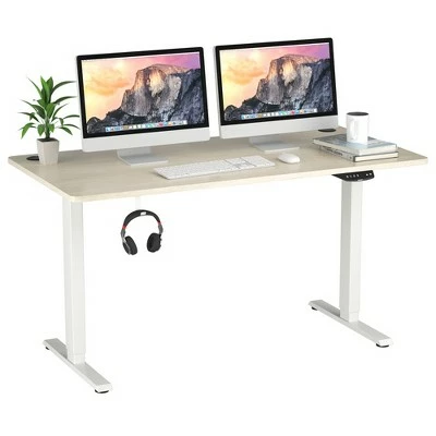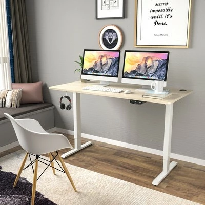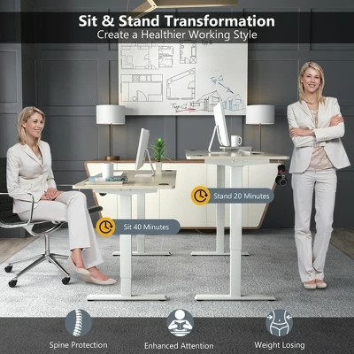 Our electric standing desk must be your first choice for a healthy working style.. Featuring 27.6” – 47.3”height adjustable design, it allows you to work at any position at will and get rid of fatigue caused by sedentary working. The advanced dual-motor system ensures smooth and quiet lift and fall. More intelligently, it will automatically stop during moving after detecting obstacles. The easy-to-operate controller allows you to preset 3 height positions, and its LED screen can show you the present height and status. In addition, it is very stable with robust metal frame and 1” thick desktop, of which bearing capacity is up to 176 lbs. . Specification: Color: White, Natural. Material: Steel, Engineered Wood, PVC. Product Dimensions:L:55” x 28” x 27.6”-47.3” (L x W x H). M:48” x 30” x 27.6”-47.3” (L x W x H). S:48” x 24” x 27.6”-47.3” (L x W x H). Net Weight: 70.5 lbs. Voltage: 110~240V. Load: 800N. Speed: 1”/s. Power Adapter Rated Input: AC100-240V,50/60Hz,2.0A. Power Adapter Rated Output: DC29.0V,2.0A,58.0W. Column Motor Rated Input: DC24V,5A. Controller Input/Output: DC29/29V. Full Load Current: 5A. Weight Capacity: 176lbs. Package Includes:. 1 x Electric Standing Desk. 1 x User Manual .