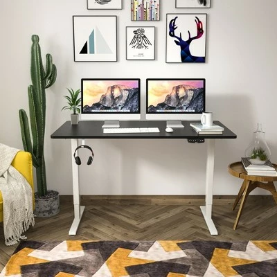 Our electric standing desk must be your first choice for a healthy working style.. Featuring 27.6” – 47.3”height adjustable design, it allows you to work at any position at will and get rid of fatigue caused by sedentary working. The advanced dual-motor system ensures smooth and quiet lift and fall. More intelligently, it will automatically stop during moving after detecting obstacles. The easy-to-operate controller allows you to preset 3 height positions, and its LED screen can show you the present height and status. In addition, it is very stable with robust metal frame and 1” thick desktop, of which bearing capacity is up to 176 lbs. . Specification: Color: White, Black. Material: Steel, Engineered Wood, PVC. Product Dimensions:L:55” x 28” x 27.6”-47.3” (L x W x H). M:48” x 30” x 27.6”-47.3” (L x W x H). S:48” x 24” x 27.6”-47.3” (L x W x H). Net Weight: 70.5 lbs. Voltage: 110~240V. Load: 800N. Speed: 1”/s. Power Adapter Rated Input: AC100-240V,50/60Hz,2.0A. Power Adapter Rated Output: DC29.0V,2.0A,58.0W. Column Motor Rated Input: DC24V,5A. Controller Input/Output: DC29/29V. Full Load Current: 5A. Weight Capacity: 176lbs. Package Includes:. 1 x Electric Standing Desk. 1 x User Manual .