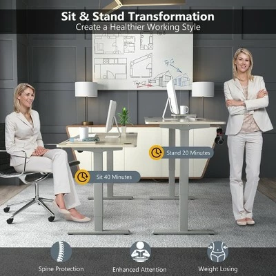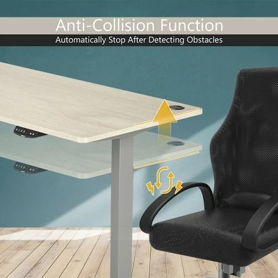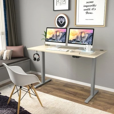 Our electric standing desk must be your first choice for a healthy working style.. Featuring 27.6” – 47.3”height adjustable design, it allows you to work at any position at will and get rid of fatigue caused by sedentary working. The advanced dual-motor system ensures smooth and quiet lift and fall. More intelligently, it will automatically stop during moving after detecting obstacles. The easy-to-operate controller allows you to preset 3 height positions, and its LED screen can show you the present height and status. In addition, it is very stable with robust metal frame and 1” thick desktop, of which bearing capacity is up to 176 lbs. . Specification: Color: Grey, Natural. Material: Steel, Engineered Wood, PVC. Product Dimensions:L:55” x 28” x 27.6”-47.3” (L x W x H). M:48” x 30” x 27.6”-47.3” (L x W x H). S:48” x 24” x 27.6”-47.3” (L x W x H). Net Weight: 70.5 lbs. Voltage: 110~240V. Load: 800N. Speed: 1”/s. Power Adapter Rated Input: AC100-240V,50/60Hz,2.0A. Power Adapter Rated Output: DC29.0V,2.0A,58.0W. Column Motor Rated Input: DC24V,5A. Controller Input/Output: DC29/29V. Full Load Current: 5A. Weight Capacity: 176lbs. Package Includes:. 1 x Electric Standing Desk. 1 x User Manual .